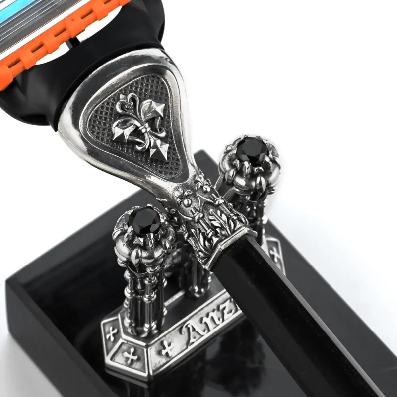 Вся фурнитура бритвы выполнена вручную ювелирами из высококачественной ювелирной бронзы. Изюминкой станка служат инкрустации из натуральных камней Swarovski и черный агат кабошонной огранки, подчеркивающий статусность бритвы.